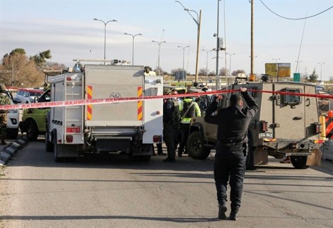 | Des membres des forces de sécurité israéliennes sur les lieux d'une tentative d'attaque au couteau contre des soldats, le 31 janvier, dans le Sud de la Cisjordanie occupée. |