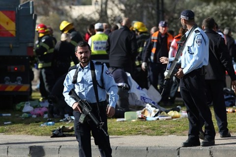 | Des membres des forces de sécurité sur les lieux d'une attaque contre des soldats israéliens, le 8 janvier à Jérusalem. |