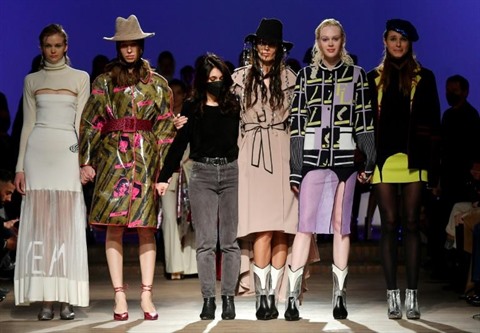 | La créatrice de mode italienne Francesca Liberatore pose avec des mannequins lors d'un défilé de mode à Milan en Italie, le 27 février. |