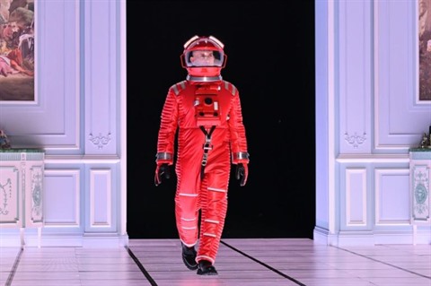 En velours et dentelles mêlés à des broderies sophistiquées, de l'or et du tulle, la collection signée du styliste Jeremy Scott s'est terminée en apothéose lorsqu'à peine tombé de la lune il est venu saluer le public en combinaison d'astronaute rouge pétard.