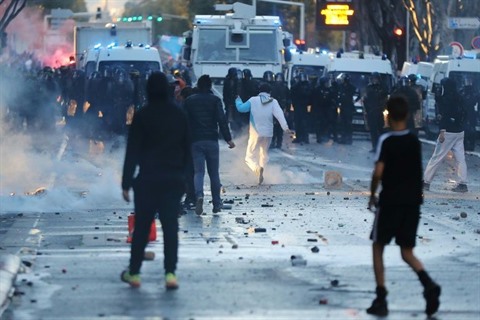 Depuis la fin d'après-midi dimanche 22 octobre, des groupes violents de supporters marseillais ont lancé des projectiles, notamment des bouteilles et des pavés, sur les forces de l'ordre, qui ont riposté avec des gaz lacrymogènes et des lances à eau. Trois membres des forces de l'ordre, policiers et gendarmes, ont été légèrement blessés, et non quatre comme précédemment annoncé par la police.