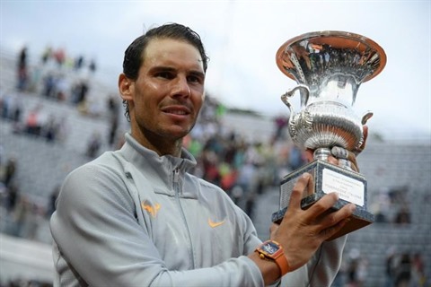 | L'Espagnol Rafael Nadal pose avec le trophée après sa victoire face à l'Allemand, Alexander Zverev, en finale du Masters 1000 de Rome, le 20 mai |