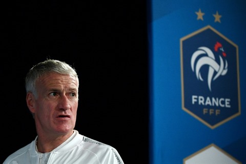 | L'entraîneur de l'équipe de France, Didier Deschamps, en conférence de presse au Stade de France, le 19 novembre 2018. |