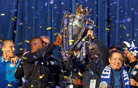 | Le président de Leicester, le Thaïlandais Vichai Srivaddhanaprabha (droite) et l'ex-entraîneur italien du club anglais, Claudio Ranieri (2e, droite), auprès du trophée de la Premier league, à Leicester, le 16 mai. |