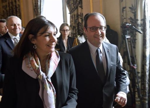 | La maire de Paris, Anne Hidalgo, et le président français François Hollande à l'Hôtel de ville de Paris le 26 mars. |