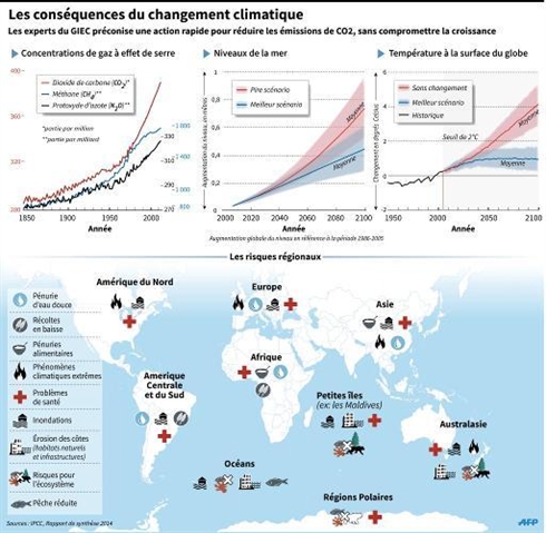 | Évolutions des gaz à effet de serre, du niveau de la mer, des températures et carte des risques régionaux selon le rapport du Giec 2014. |