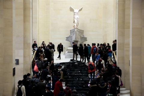 | Des membres de l'ONG 350.org déposent symboliquement une "rivière de pétrole" aux pieds de la Victoire de Samothrace au Louvre, le 5 mars. |
