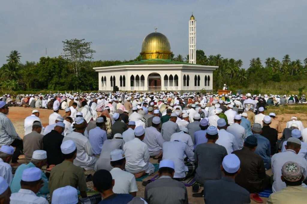| Des musulmans se rassemblent pour prier pour l'arrivée de la pluie lors d'une période de canicule dans la province de Narathiwat, au sud de la Thaïlande, le 4 mai 2024. |