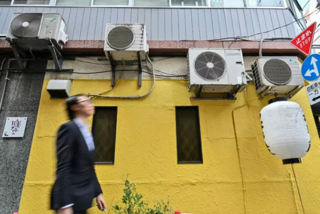 | Un homme passe devant des blocs de climatiseurs le 2 mai 2024 à Tokyo, au Japon. |