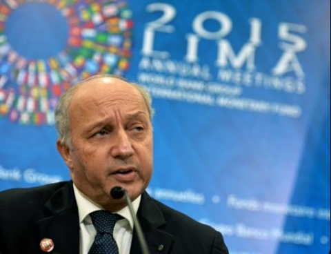 | Le ministre français des Affaires étrangères Laurent Fabius le 9 octobre 2015 à Lima. |