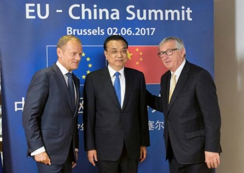 | Le président du Conseil européen Donald Tusk (premier à gauche), le Premier ministre chinois Li Keqiang (centre) et le président de la Commission européenne Jean-Claude Juncker, à Bruxelles, le 1er juin 2017 |