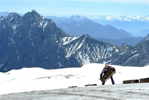 | Installation d'une toile sur le glacier de la Zugspitze, la plus haute montagne d'Allemagne, dont la fonte s'accélère, le 10 mai 2011 près de Garmisch-Partenkirchen. |