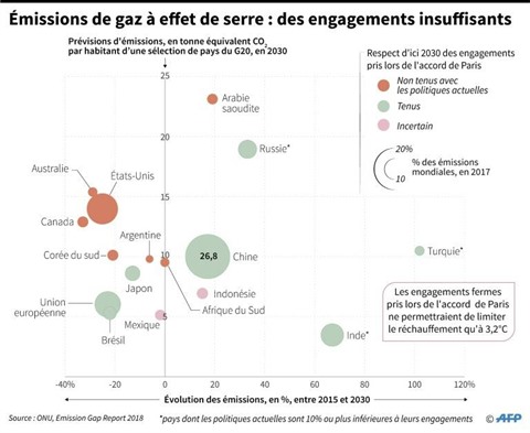 Un récent rapport des scientifiques du Giec, tout en évoquant les nettes différences en termes d'impacts attendus entre ces deux objectifs, a aussi souligné qu'il faudrait, pour rester sous +1,5°C, réduire les émissions de CO2 de près de 50% d'ici à 2030 par rapport à 2010.