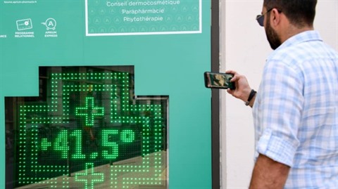 | Un thermomètre en vitrine d'une pharmacie affiche la température, lors d'une vague de chaleur à Paris, le 25 juillet 2019. |