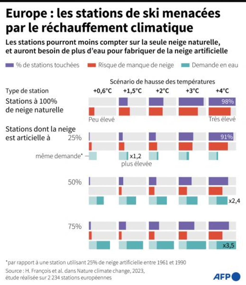 En recourant à la production de neige artificielle, la proportion de stations à risque baisserait à 27% (hausse de 2°C) et 71% (4°C).