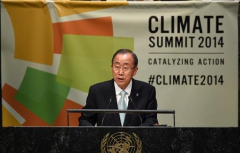 | Le secrétaire général de l'ONU, Ban Ki-moon, s'exprime le 23 septembre à New York lors du sommet sur le climat. |