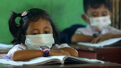 | Des écoliers portent des masques sanitaires dans une salle de classe de l'île indonésienne de Natuna, le 4 février. |