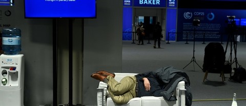 | Un homme épuisé dort pendant les négociations finales de la COP25, dans la nuit du 14 au 15 décembre à Madrid. |