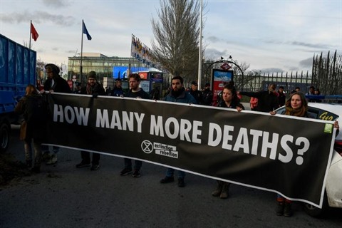 | Des militants d'Extinction Rebellion brandissent une banderole "Encore combien de morts ?". |