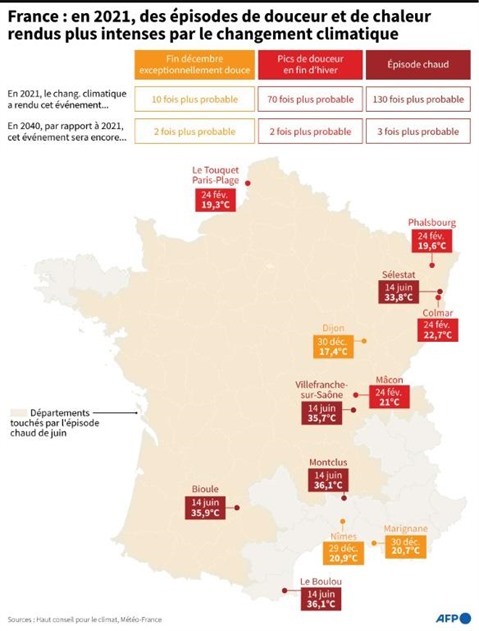 | Événements météorologiques survenus en 2021 en France métropolitaine et rendus plus probables par le changement climatique, selon le Haut conseil pour le climat. |