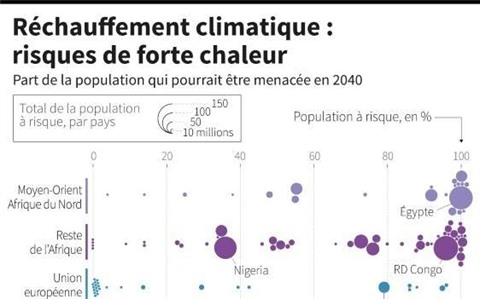 | Infographie sur la part de population qui pourrait être menacée par des risques de forte chaleur en 2040, par pays et régions du monde. |