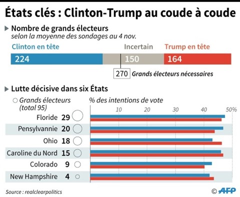 Le suspense côté sondages concerne une douzaine d'États-clés, où les deux camps concentrent leurs déplacements. Hillary Clinton y domine dans une majorité de sondages récents, mais certains donnent des sueurs froides aux démocrates.