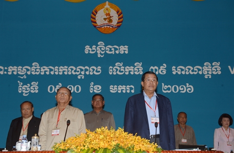 | Le président du PPC, Hun Sen (droite, 1er plan) lors de la 39e réunion du Parti du Peuple cambodgien, le 9 janvier à Phnom Penh. |