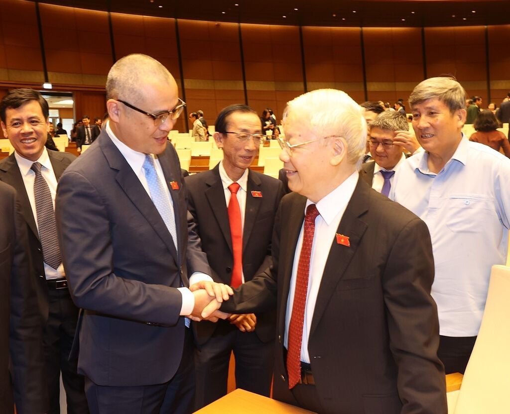 | Le secrétaire général du PCV, Nguyên Phu Trong (droite), et des députés de l'Assemblée nationale de la XVe législature lors de sa 5e session. |