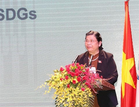 | La vice-présidente permanente de l'Assemblée nationale, Tong Thi Phong, prend la parole lors de la conférence. |