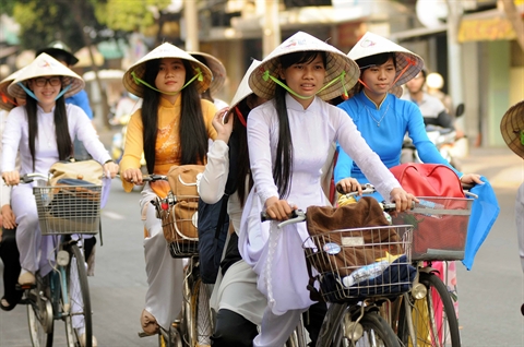 | Des volontaires portant l’áo dài pédalent le 20 mars dans la rue de Hô Chi Minh-Ville dans le cadre du programme «Áo dài vietnamien - Tourisme vietnamien». |