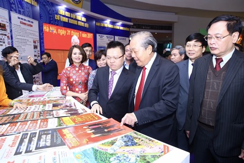 | Le vice-Premier ministre permanent Truong Hoà Binh (2e à droite) visite le stand de l'Agence vietnamienne d’information, titulaire du Prix A pour la catégorie de "stand impressionnant et distingué" |