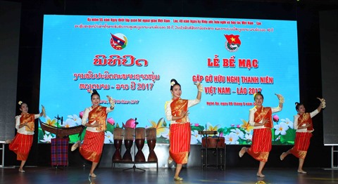 | Un numéro artistique du Laos interprété lors de l'ouverture de la rencontre d'amitié entre les jeunes Vietnam - Laos. |
