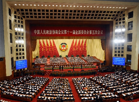 | Vue générale de la réunion de clôture du 11e Comité national de la Conférence consultative politique du peuple chinois (CCPPC). |