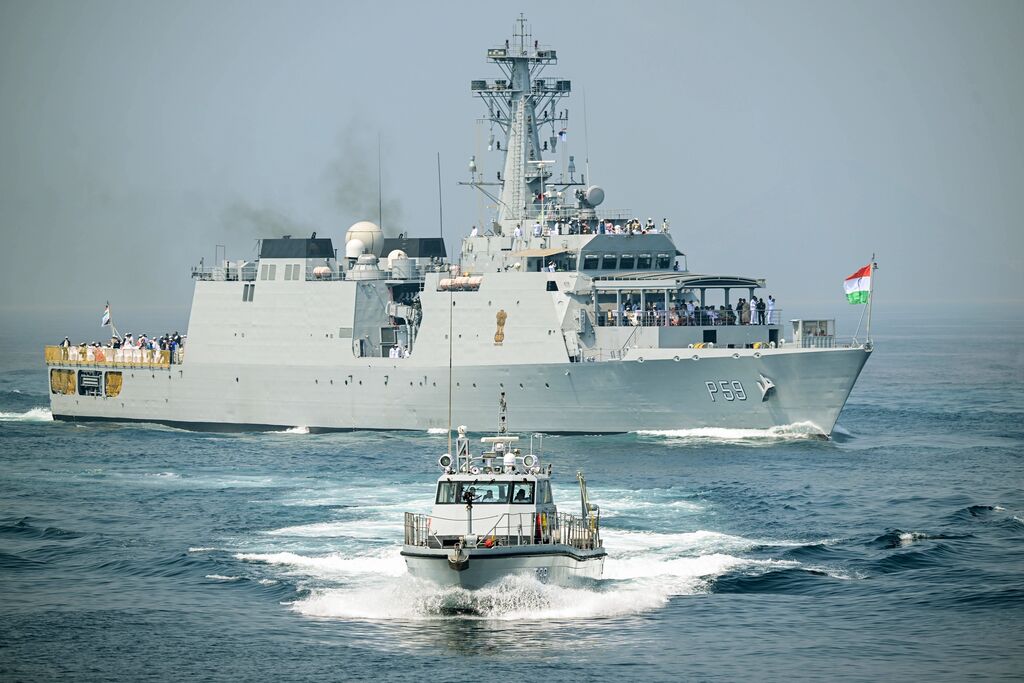 | Un navire participant à une revue navale au large de Visakhapatnam, dans l’État d’Andhra Pradesh (Inde), le 18 février 2026. |