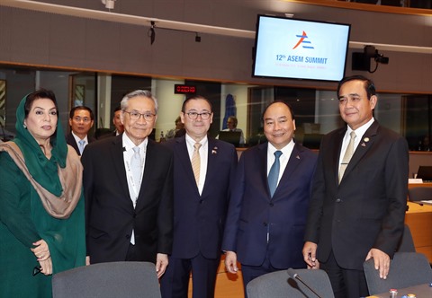 | Le PM Nguyên Xuân Phuc (2e à droite) et les dirigeants participés à l'ASEM 12. |