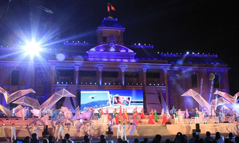 | Un spectacle artistique de la cérémonie de clôture du 7e Festival maritime de Nha Trang 2015, le soir du 14 juillet dans la ville éponyme. |