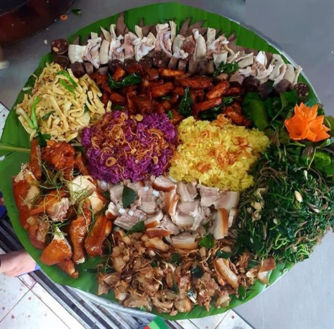 À l’occasion des fêtes, notamment du Têt traditionnel, pour rendre hommage et exprimer vénération et reconnaissance envers les ancêtres, les femmes Muong cuisinent ce plateau de plats qui est déposé sur l’autel.