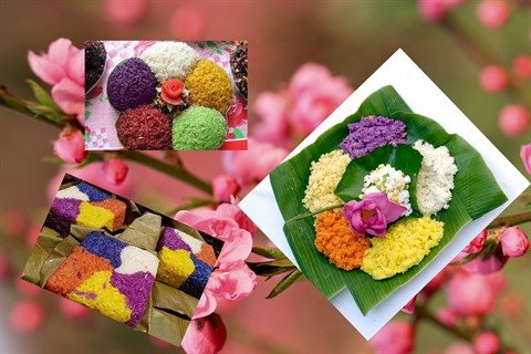 Il y a aussi le xôi ngu sac (riz gluant aux cinq couleurs), qui doit son nom aux cinq couleurs qui la caractérisent : rouge, jaune, vert (ou violet), noir et blanc. Ces couleurs représentent les cinq éléments de base du Cosmos. Les Muong utilisent différentes herbes et légumes sauvages pour colorer le riz. Pour le rouge, l’emploi de chair de momordique, pour le noir, de la feuille de thau, pour le jaune, de vieux curcuma, et pour le vert, de feuille de gingembre. Après trempage, le riz est cuit à la vapeur...