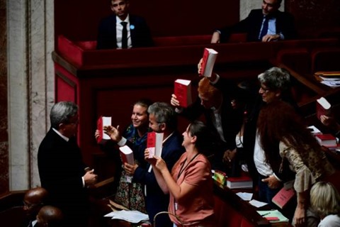 | Des députés de la France insoumise brandissent le Code du travail à l'Assemblée nationale à Paris, le 4 juillet. |