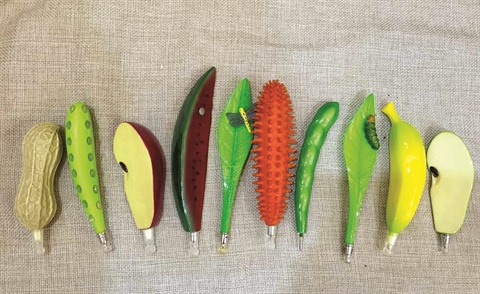 Alors qu’il nous ouvre son armoire, nous le questionnons : «Pourquoi conservez-vous aussi des miniatures de fruits, des statues et des briquets ?». Il éclate de rire et répond que ce sont aussi des stylos. «Regardez ! J’ai un stylo long comme le bras et un autre pas plus gros qu’une aiguille. J’ai toutes les tailles dans ma collection, toutes les matières premières aussi : plastique, fer, bambou, bois, etc.».