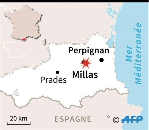 | Localisation de Millas, où un bus scolaire a été percuté par un train à un passage à niveau. |