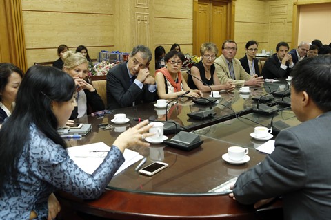 | Rencontre entre la ministre de la Santé, Mme Nguyên Thi Kim Tiên (gauche), et 15 spécialistes français, le 26 avril à Hanoï. |