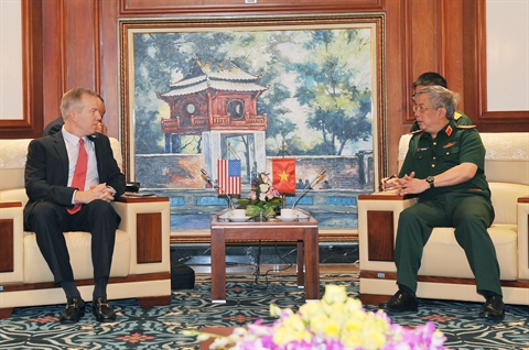| Le vice-ministre vietnamien de la Défense, Nguyên Chi Vinh (droite), rencontre l'ambassadeur des États-Unis au Vietnam, Ted Osius, le 27 juillet. |