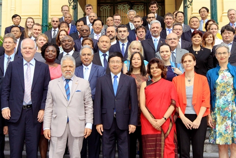 | Le vice-Premier ministre et ministre des Affaires étrangères, Pham Binh Minh (1er plan, centre), et des diplomates internationaux, le 21 août à Hanoi. |