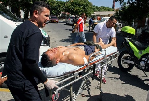 | Un policier blessé dans l'attaque à l'explosif d'un commissariat dans la ville portuaire de Barranquilla (Nord de la Colombie), le 27 janvier. |
