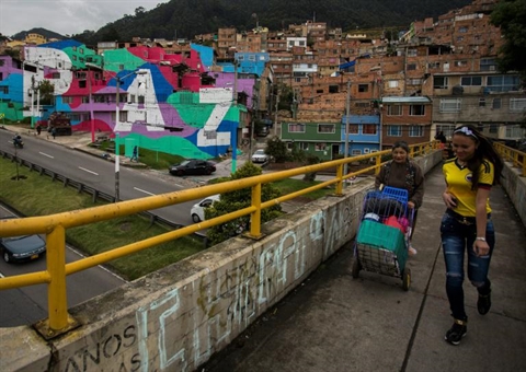 Surplombant la Circunvalar, avenue qui sinue dans la montagne pour relier le cœur de Bogota aux quartiers aisés du nord, les immenses lettres blanches du mot "Paz" (paix) claquent sur le fond vert, violet, rose et bleu, dont ont été préalablement peintes les masures du quartier Mariscal Sucre.