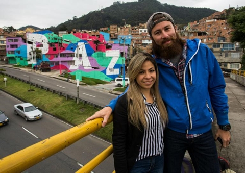 | Spag, un des auteurs français de la fresque, pose devant l'œuvre de streetart réalisée sur les façades de maisons du quartier pauvre de Mariscal Sucre, à Bogota, le 1er septembre. |