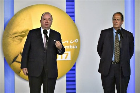 | Le ministre colombien de la Défense, Luis Carlos Villegas (gauche), et le chef négociateur du gouvernement colombien, Juan Camilo Restrepo, le 5 septembre 2017 à Bogota. |