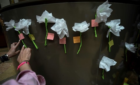 | Des fleurs déposées à l'endroit de l'attentat dans le centre commercial de Colombie. |