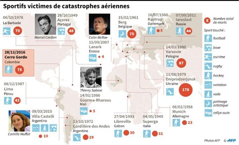 | Sportifs tués dans des catastrophes aériennes, dates, bilans et sports concernés. |